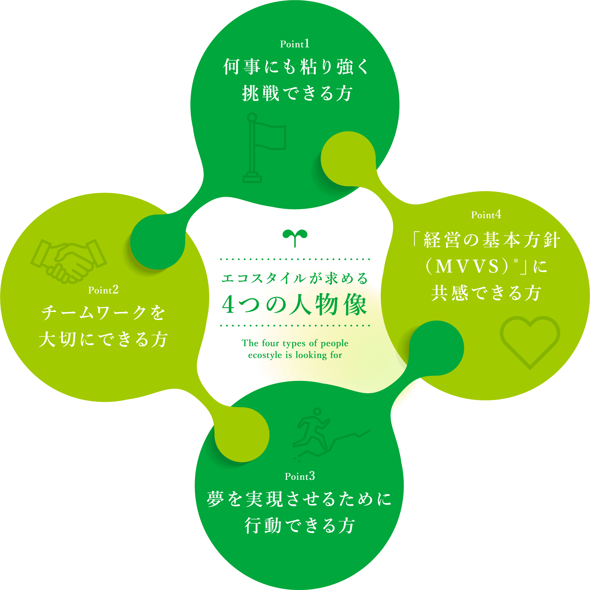 共感できる方Mission(果たすべき使命)、Vision(実現する未来)、Value(提供する価値・価値基準)、Spirit(大切にする精神)には、お客様、地域社会、そして私たち自身に対して「こうありたい」という想いが込められています。これらに共感し、体現できる方を求めています。