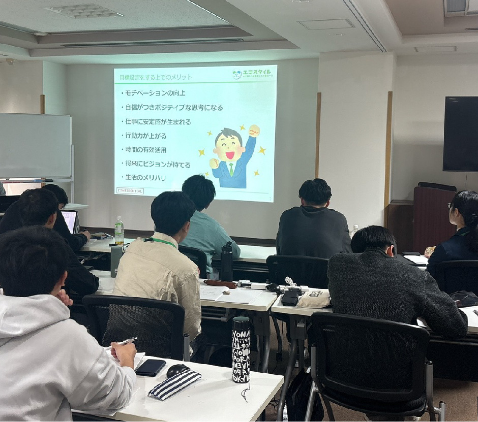入社式後の2~3週間(配属先により変動)で実施する基礎研修です。社会人としての心構え、ビジネスマナー、事業スキームや太陽光発電の基礎知識、各部署の役割などを大阪本社で学び、配属先でのスタートダッシュに備えます。同期入社の社員からも様々な学びや気づきが得られる機会です。